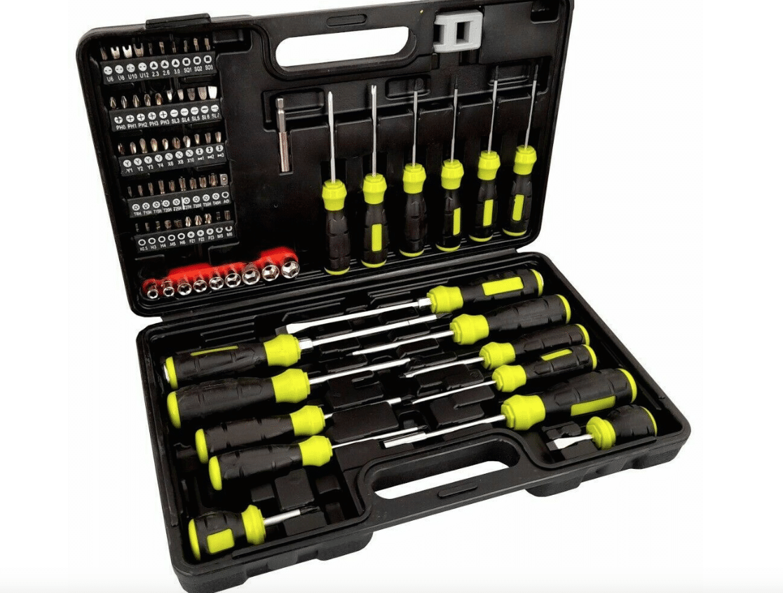 Juego compuesto por destornilladores y puntas de varias formas: Cortado, Cruzado, TORX, en forma de U, en forma de Y.
