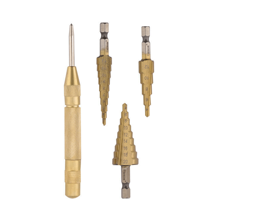 KIT DE PUNZÓN DE GATILLO AUTOMÁTICO PARA FRESAS ESCALONADAS DE CENTRADO DE TALADROS 3 12 4 20 MM HKIT COMPUESTO POR:3X TAMAÑOS DE CORTADORES ESCALONADOS:3 12 mm4 12 mm4 20 mm+1X TALADRO DE CENTRADO DE PUNZÓN A PRESIÓN