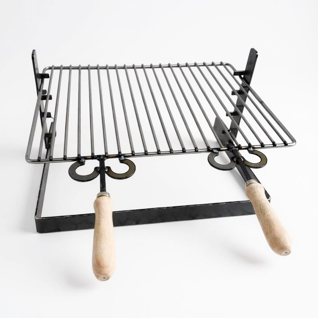 Ventajas: Sistema Ajustable: La parrilla está diseñada para adaptarse a diferentes alturas y tipos de cocción, lo que permite gestionar de forma óptima el calor para carnes, pescados o verduras.Base Estable: Equipada con patas robustas que permiten colocarla directamente sobre las brasas o dentro de la chimenea, garantizando estabilidad y seguridad.Mangos Ergonómicos de Madera: Los mangos de madera natural no solo le dan un aspecto rústico, sino que también protegen las manos del calor, permitiéndole mover o ajustar la parrilla sin quemarse.Gran Superficie de Cocción: Con 60 cm de ancho, es ideal para barbacoas en familia o con amigos, ofreciendo suficiente espacio para varios platos a la vez.