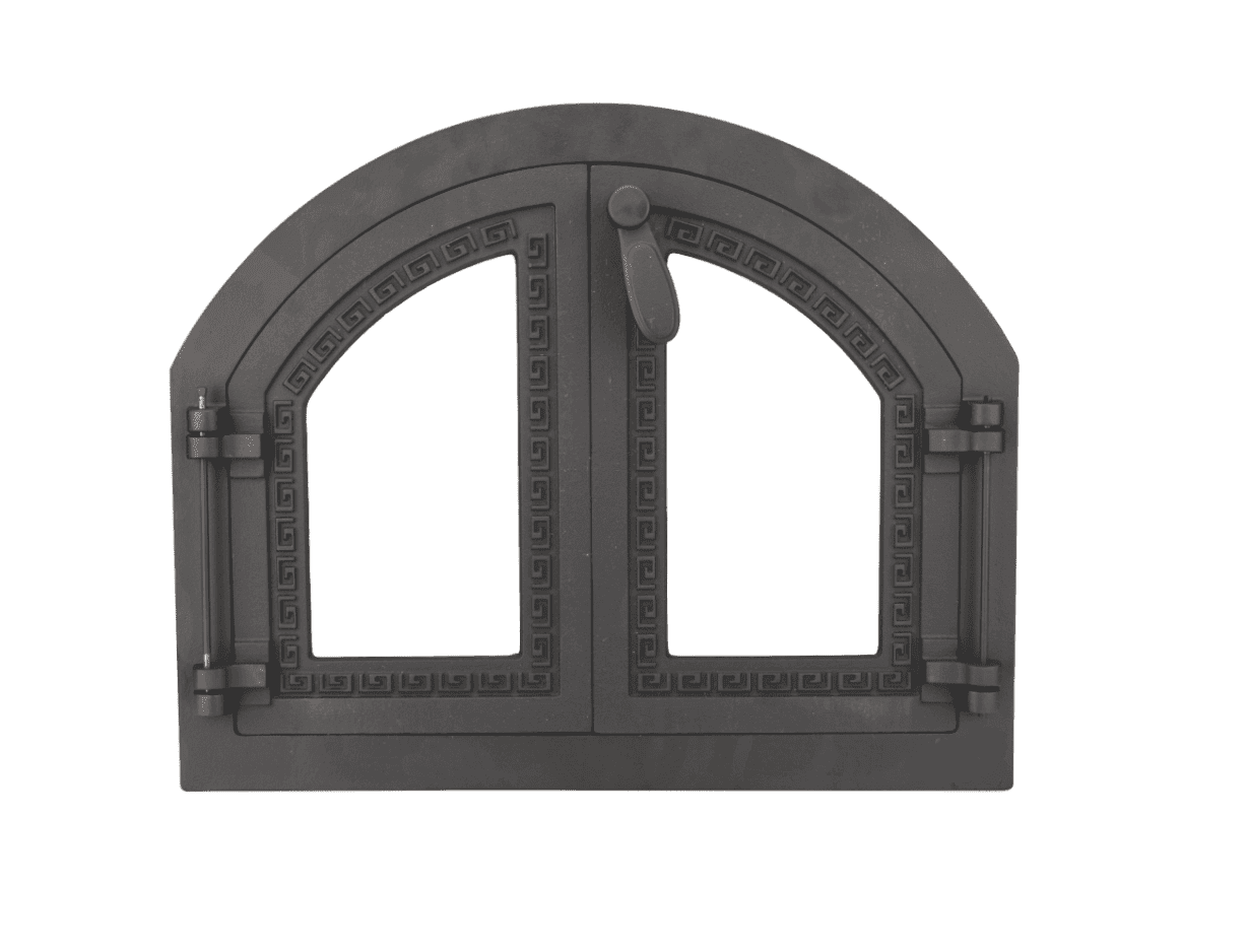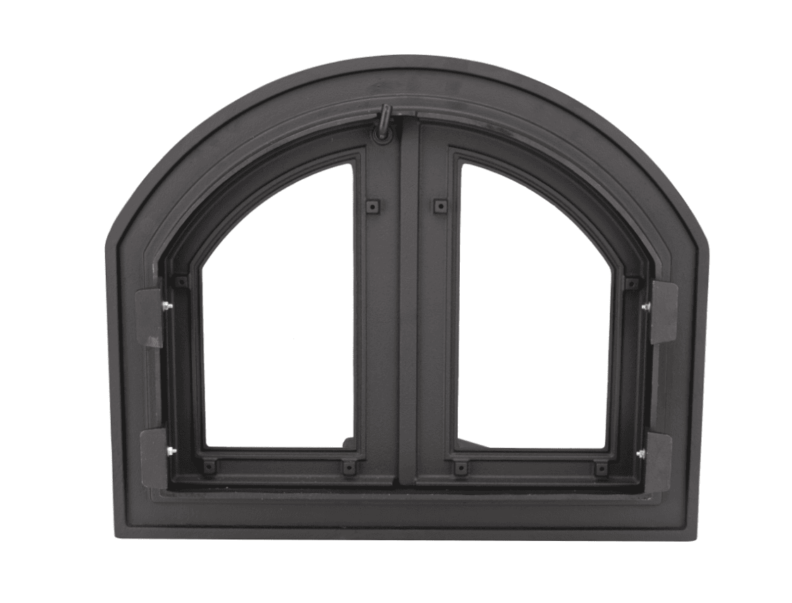 Fabricado en hierro fundido, reconocido por su durabilidad y resistencia a altas temperaturas.Diseño: Presenta un diseño arqueado con dos puertas que se abren y se unen en el centro.Uso: Diseñado para hornos de exterior, barbacoas o chimeneas, para cerrar la abertura y regular la temperatura.Dimensiones: Las dimensiones específicas de este modelo son: Alto [mm]: 480 y Ancho [mm]: 590.Material: Hierro fundido.Dimensiones de montaje (An x Al x Al): 510 x 212 x 385 mm.